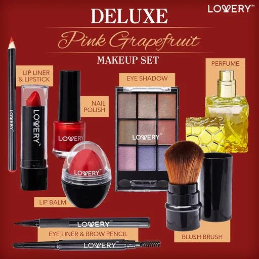 DELUXE 30 PIECE TRAIN CASE SET This massive spa gift basket has everything a woman needs! It includes Shower Gel, Bubble Bath, Body Lotion, Bath Salt, 4 Bath Bombs, Lip Liner, Eyebrow Pencil, Eyeliner Pencil, Blush Brush, Pink Grapefruit Scented Red Lip Balm, Lipstick, Red Nail Polish, 9 Shades of Eye Shadow with Brush, Glass Perfume and Mirror. Packed in a stunningly wrapped gift box, it also has a gift note card for you to personalize it. Top off you home-spa experience with a set of makeup and cosmetics that is sure to make you feel like majestic royalty. As the eye shadow, eye liner pencils and blush enhance your facial beauty, the nail polish and fragrantly citrus perfume will give you a sense of charm and grace. The huge gift is packaged in a stunningly elegant reusable crocodile leather gift box with numerous compartments. Every Lovery product is 100% Paraben and Cruelty-Free. These enriching beauty products are made with moisturizing Shea Butter and nourishing Vitamin E.