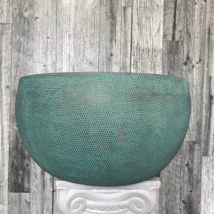 This low set ceramic pot is perfect for any plant! This pot has a drainage holde to improve watering and drainage and is finished with a beautiful blue snakeskin texture.
