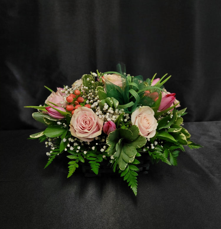 The Blush Basket features a delicate blush pink arrangement of blooms artistically arranged inside a woven basket. Its subtle hue pairs well with a variety of styles and can easily become part of any interior. Let this colorful and vibrant piece brighten any decor and stand out with its unique beauty.
