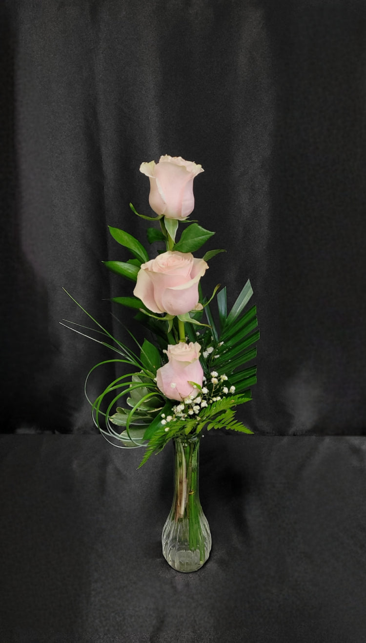 Blush Three is a beautiful and timeless bouquet of three vintage pink roses, baby's breath and lush greenery. Perfect for any special occasion, this classic combination delivers a romantic and joyful sentiment.