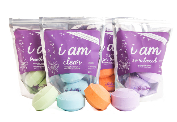 I am breathtaking | pack of 3 shower steamers | peppermint wintergreen spearmint ingredients: sodium bicarbonate, citric acid, menthol crystals, aqua, spearmint oil, peppermint oil, wintergreen oil, ci 118965, ci 74180 & ci 10020.