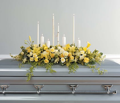 A bright casket spray featuring candles and fresh flowers and greens. Funeral Home & Wake Flowers