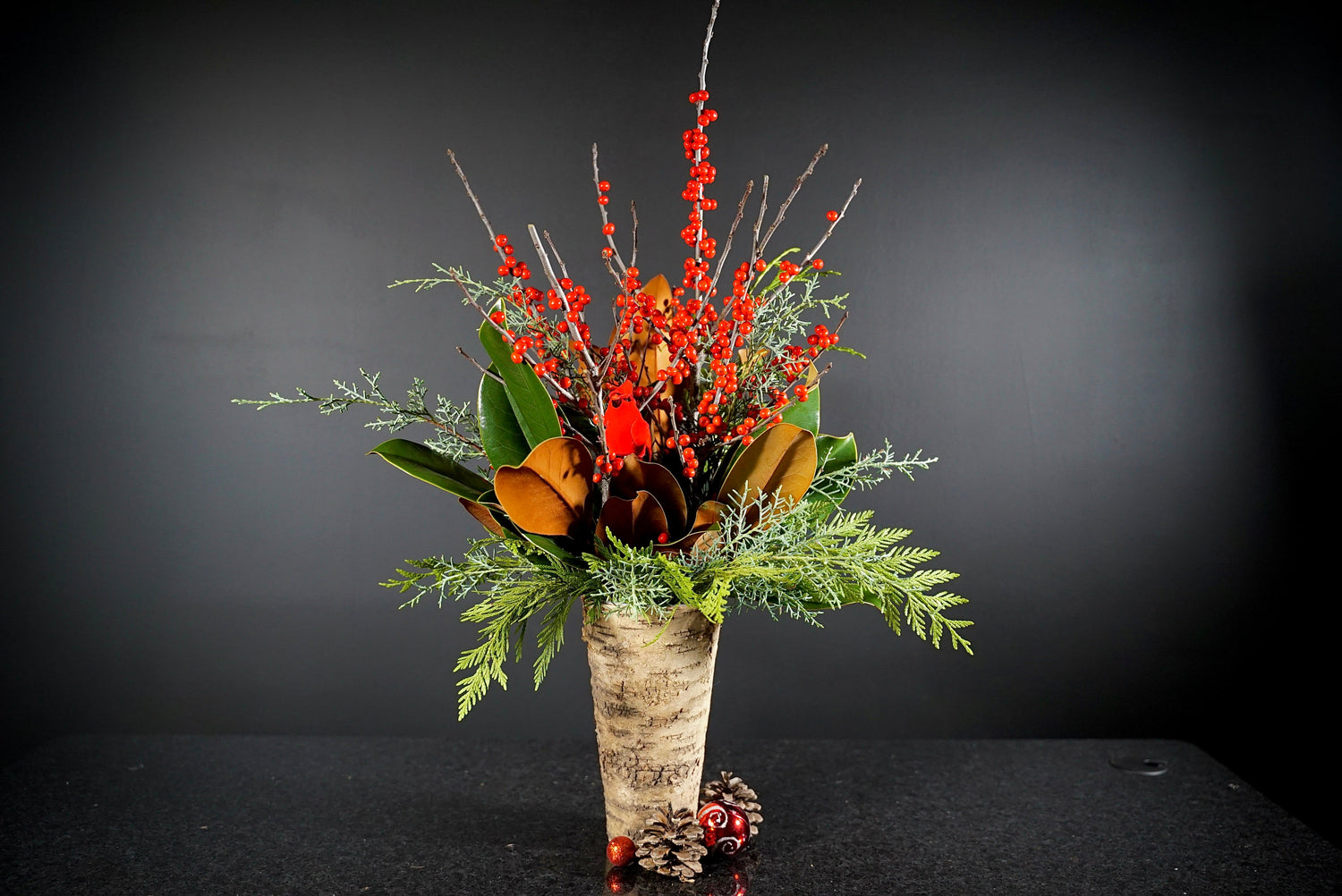 Arrangement in a birch vase with berries and evergreens featuring a red cardinal bringing a touch of nature indoors for the holidays.