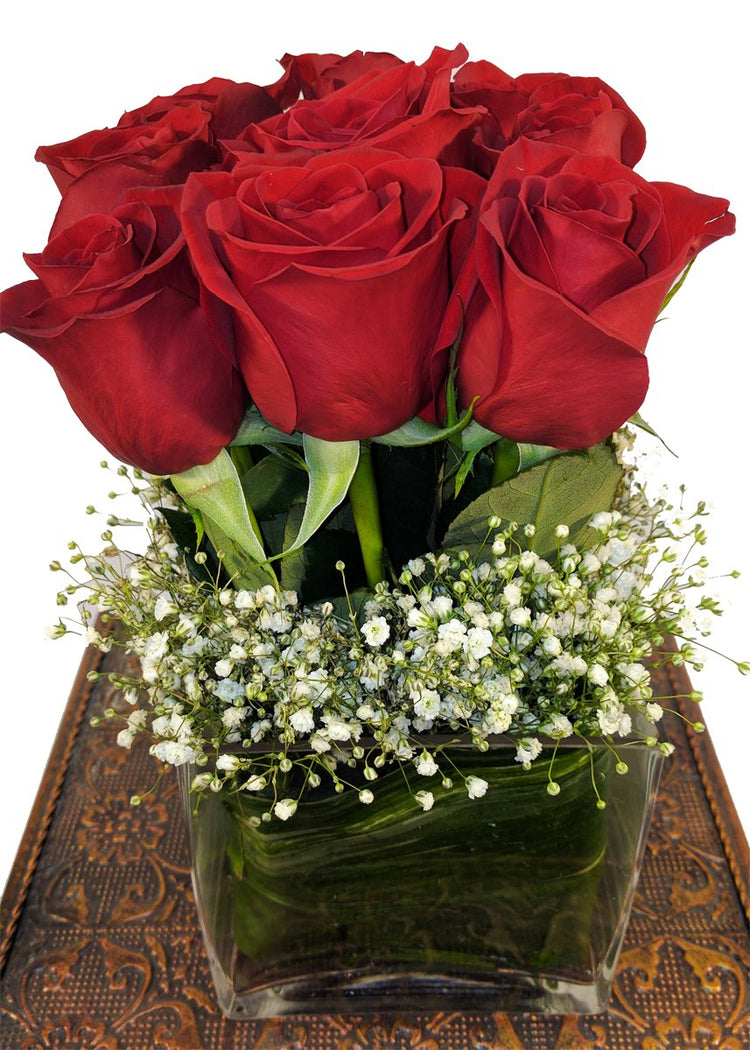 Rose Cube Arrangement with 9 roses, baby's breath, tropical greens and filler.