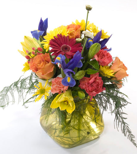 This cube arrangement includes Carnations, Lilies, Orchids , Delphinium and greens with butterflies