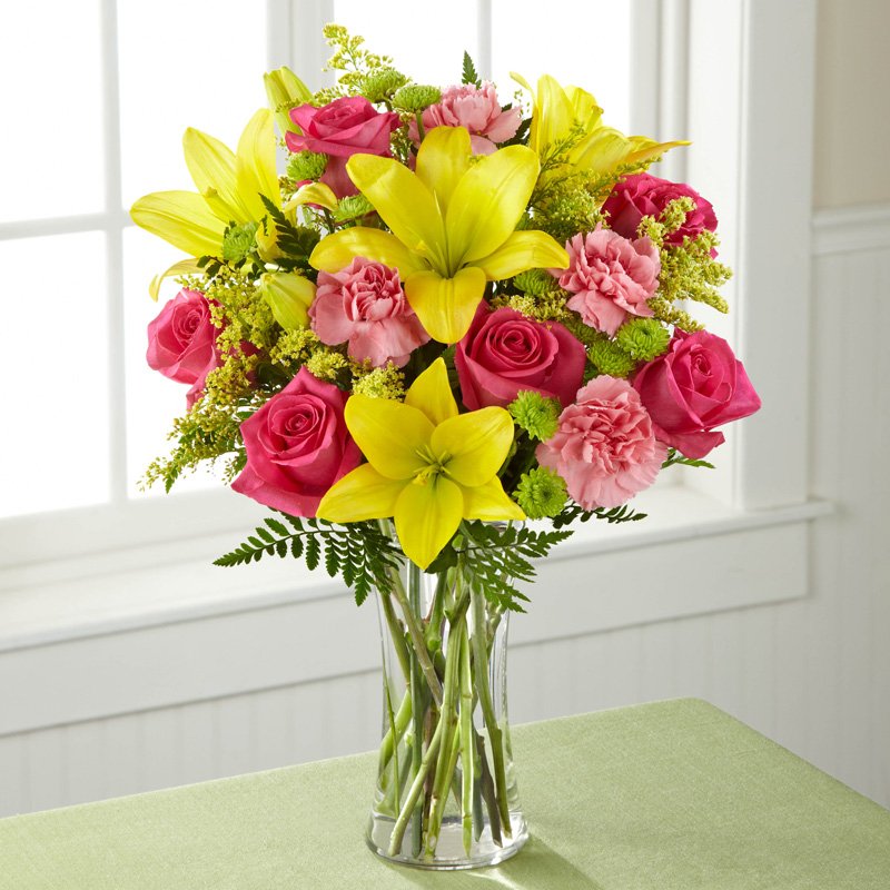 Light, lovely, and set to surprise and delight your recipient with it's bright blooms, this flower bouquet speaks to the magic that each day holds. Brilliant yellow Asiatic Lilies are surrounded by hot pink roses, pink carnations, yellow solidago, and lush greens, beautifully arranged in a classic clear glass vase to create a gift that exudes warmth and happiness. A wonderful way to celebrate a birthday, or express your thank you, or congratulations wishes!