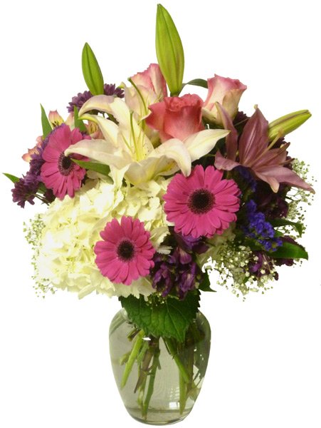 A lovely glass arrangement featuring roses, lilies, gerberas, alstromeria and greens