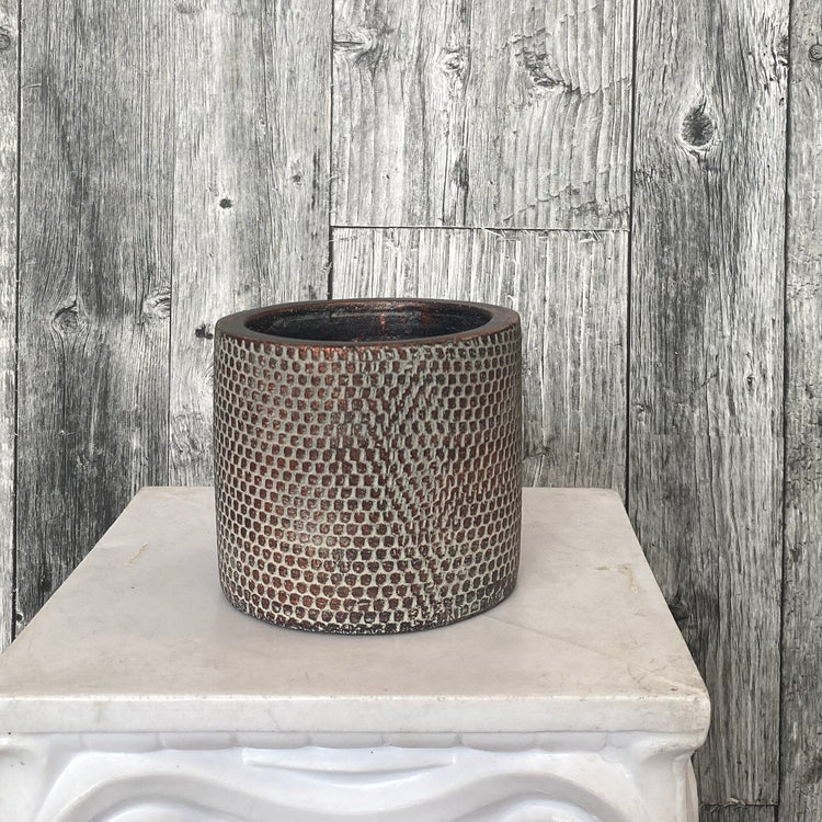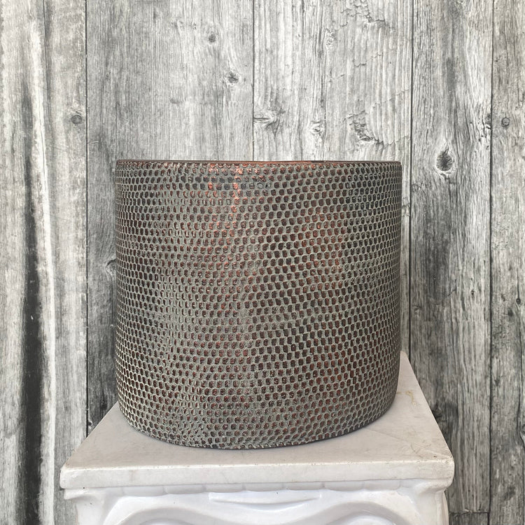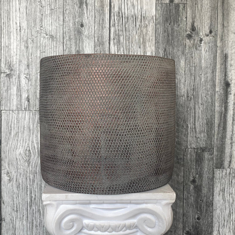 This ceramic pot is perfect for any plant! With a drainage hole you never have to worry about over watering. This pot has snake skin detailing in a beautiful bronze colour.