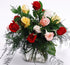 This beautiful creation in a glass vase is filled with an assortment of colored Roses (12) and greens