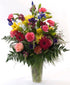 Bright and colourful, this item features a mix of Snapdragons, Carnations, Gerberas, Irises, Roses, Lilies and an assortment of greens in a glass vase