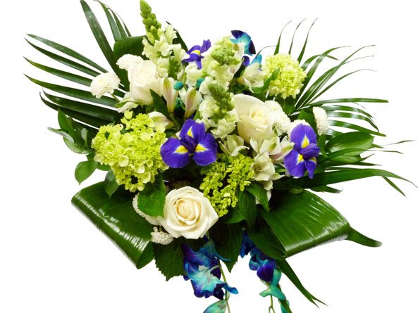 This presentation style bouquet features stunning Orchids, Mini Hydrangeas, Alstromeria, Snap dragons, Roses and exotic greens