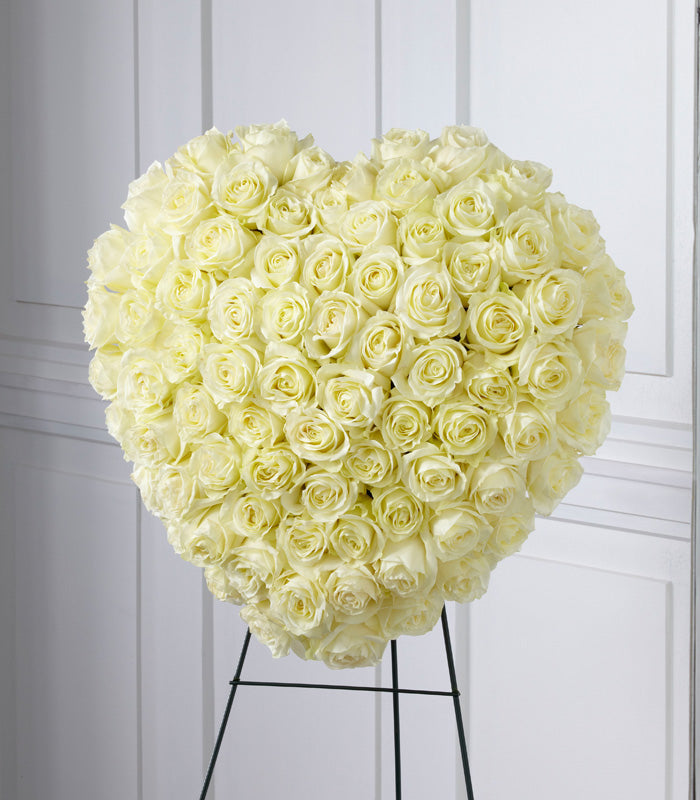The Elegant Remembrance™ Standing Heart is an exquisite display of peace and love. 77 stems of white roses are artfully arranged in the shape of a heart and presented on a wire easel, creating a simply beautiful tribute for their final farewell service.