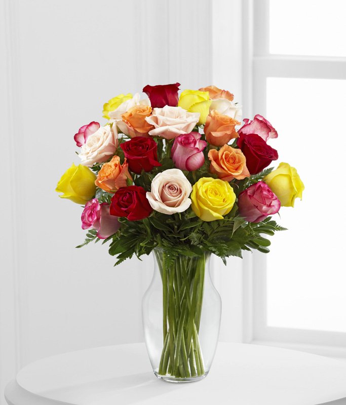 The Enchanting™ Rose Bouquet is a classic expression of love and sweet affection! 24 mixed roses arrive accented with lush greens, all beautifully arranged in a clear glass vase.