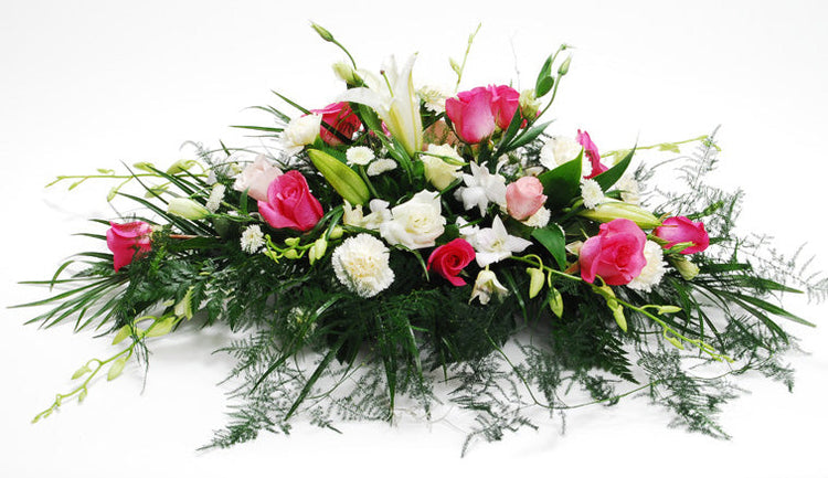 Eternal Life Centerpiece features Orchids, Lilies, Roses and mixed greens