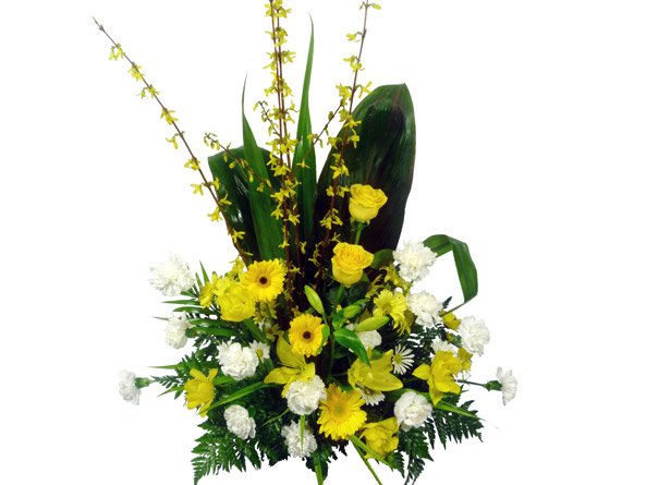 An Everlasting Memory of someone you loved. This funeral container is filled with Roses, Lilies, Gerberas, Carnations, Daffodils, Forsithia, mini Carnations, filler and greens