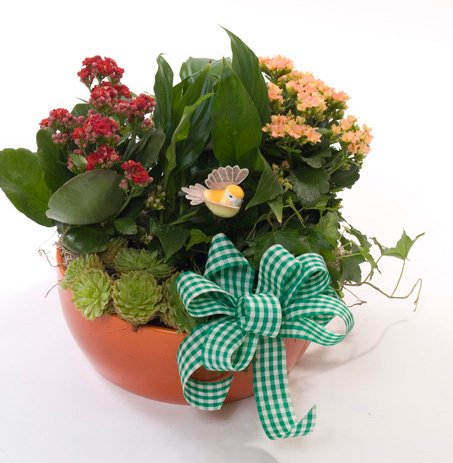 Fancy-Free Garden features a variety of greens and blooms with ribbon and a decorative ornament