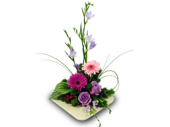 A delightful piece with Gerberas, Roses, Berries, Freesia and greens in a low container