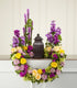 This masterpiece of floral sympathy creates a beautiful and reverential tabletop setting for an urn holding the cremated remains of your loved one. Handcrafted by a local artisan florist, this stunning and original creation is perfect for formal visitation or memorial services. Constructed on a modified wreath frame, it combines cream and yellow roses, fuchsia Dianthus, purple Liatris and