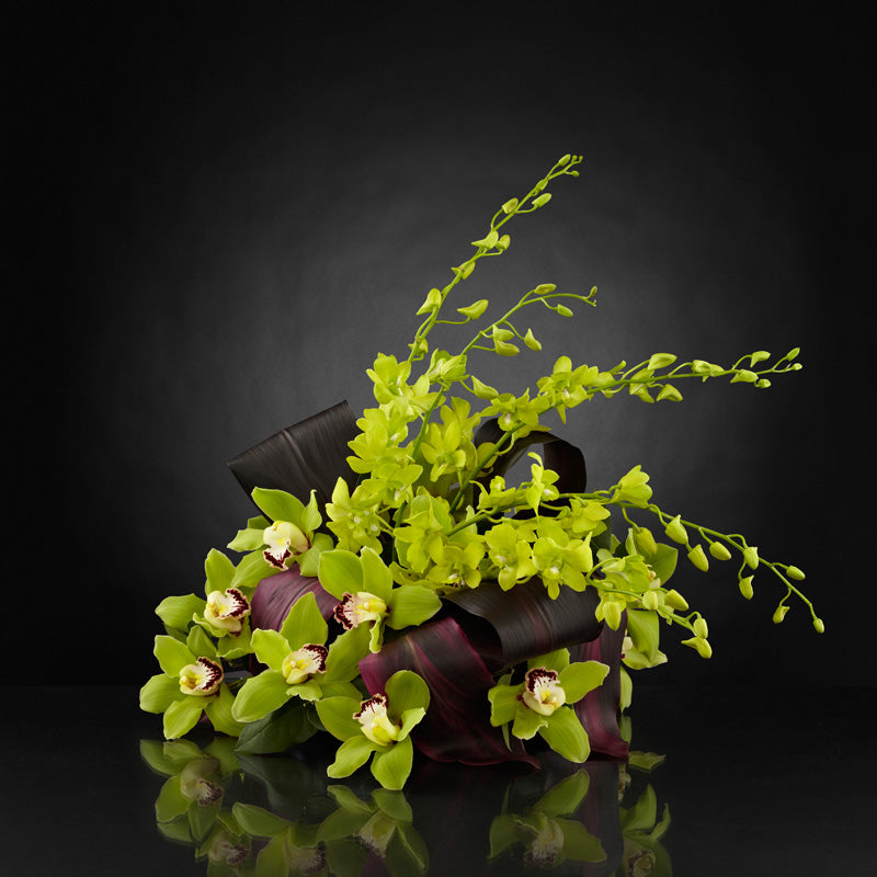 Glamour Luxury Bouquet. Artisan designed and arranged to delight the senses, this floral arrangement flaunts a deep, rich color palette that makes it a standout selection. With the use of jade green cymbidium and dendrobium orchids, this bouquet is reminiscent of the first pops of bright green that let you know spring has finally arrived.