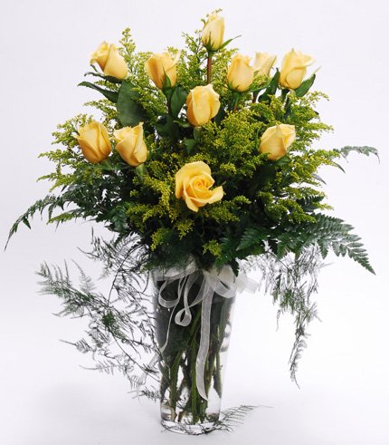 This glass vase holds 12 beautiful yellow Roses, greens with ribbon