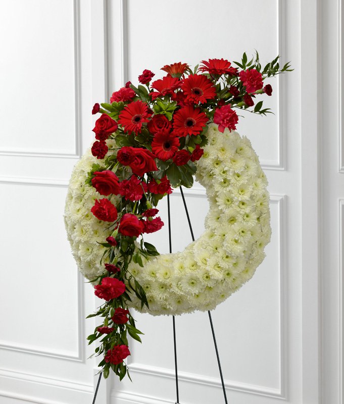 The Graceful Tribute™ Wreath creates a stunning presentation of love's serenity for their final farewell service. Red roses, carnations and gerbera daisies are accented with burgundy mini carnations and a variety of lush greens to create a sweeping arrangement that glides across the face of a snow white wreath consisting of chrysanthemums making this a remembrance for one who has touched your life like none other. Displayed on a wire easel.