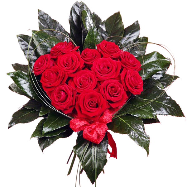 Heart shaped cut bouquet featuring red roses and outlined with premium greens