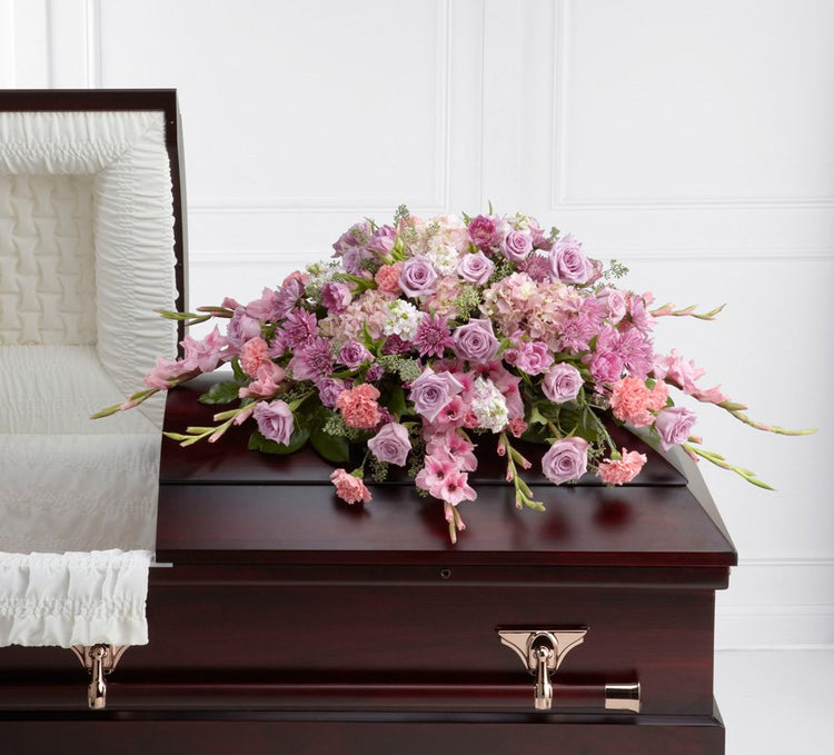 The Immorata™ Casket Spray offers soft beauty and blushing comfort to honor the life of the deceased. Lavender roses, chrysanthemums and parrot tulips are elegantly arranged amongst pink carnations, gladiolus, stock, hydrangea and lush greens to create a presentation, intended to bedeck the top of the casket, that evokes sweet memories of your loved one for their final farewell service.