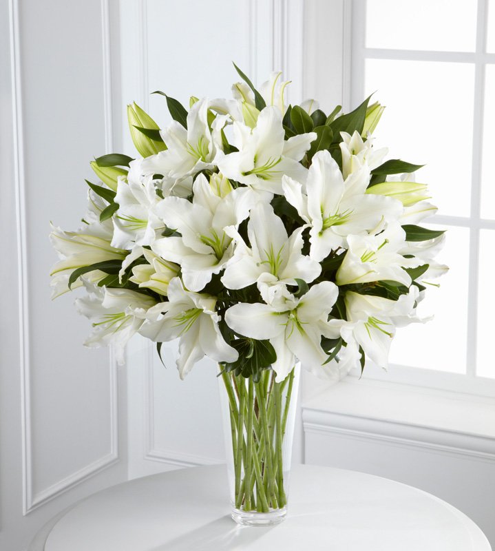 The Light In Your Honor™ Bouquet is a beautifully bright arrangement bursting with elegant fragrance to convey your deepest sympathies for the loss of their loved one. A stunning bouquet of gorgeous Oriental lilies are accented with lush greens and seated in a clear glass vase to create a bouquet that is serenely sophisticated, offering comfort and peace in their time of need.