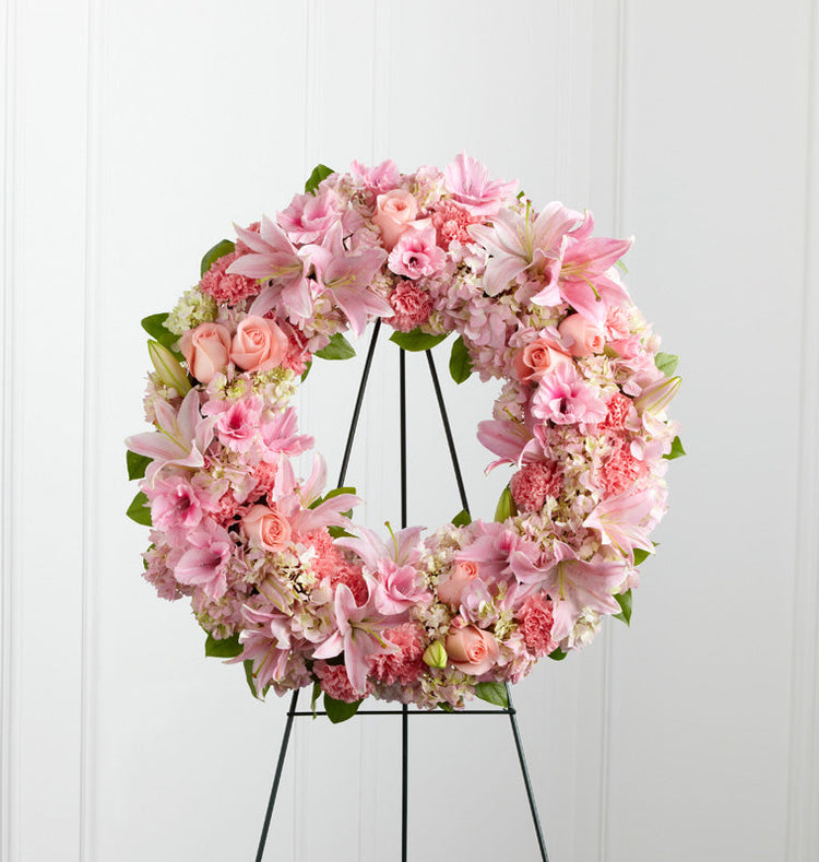 The Loving Remembrance™ Wreath is a blushing display of grace and beauty to honor the life of the deceased at their final tribute. Pink roses, Oriental lilies, gladiolus, hydrangea and carnations are brought together with lush greens to form the shape of a wreath, offering warmth and comfort with its sweetly sophisticated elegance. Displayed on a wire easel.