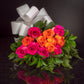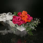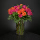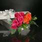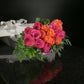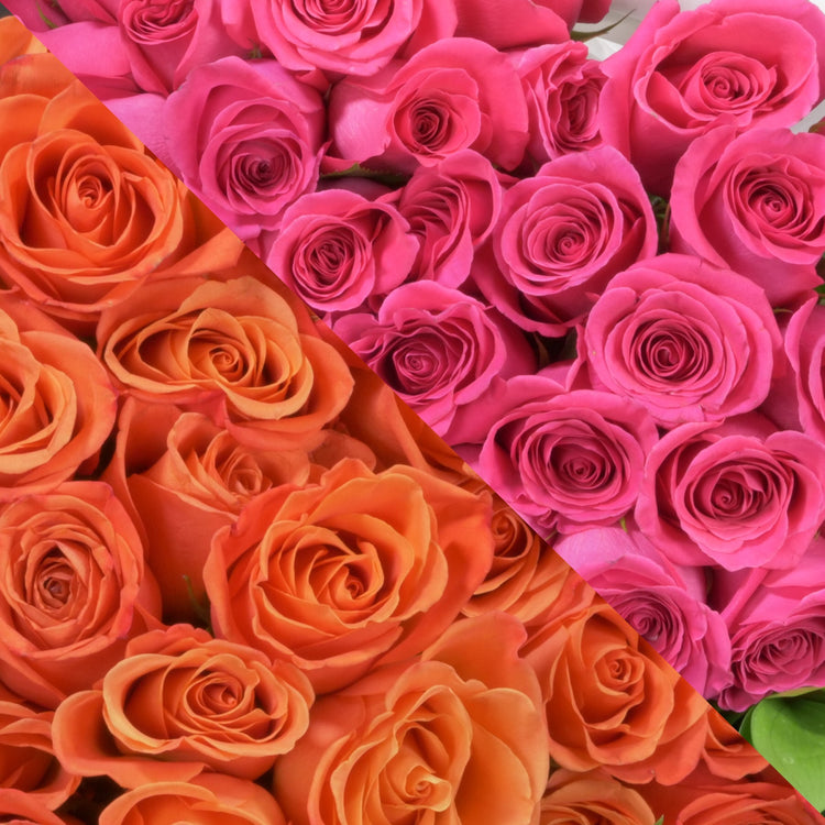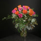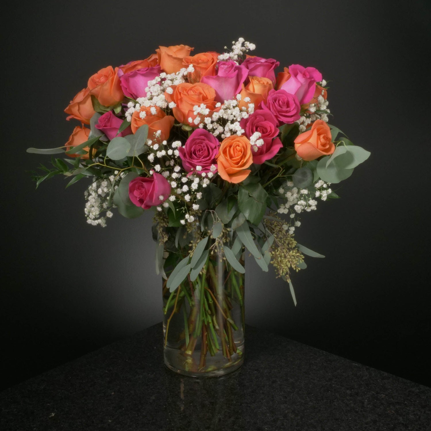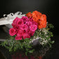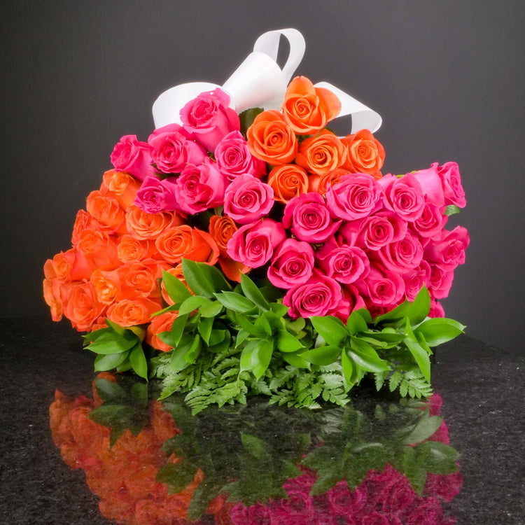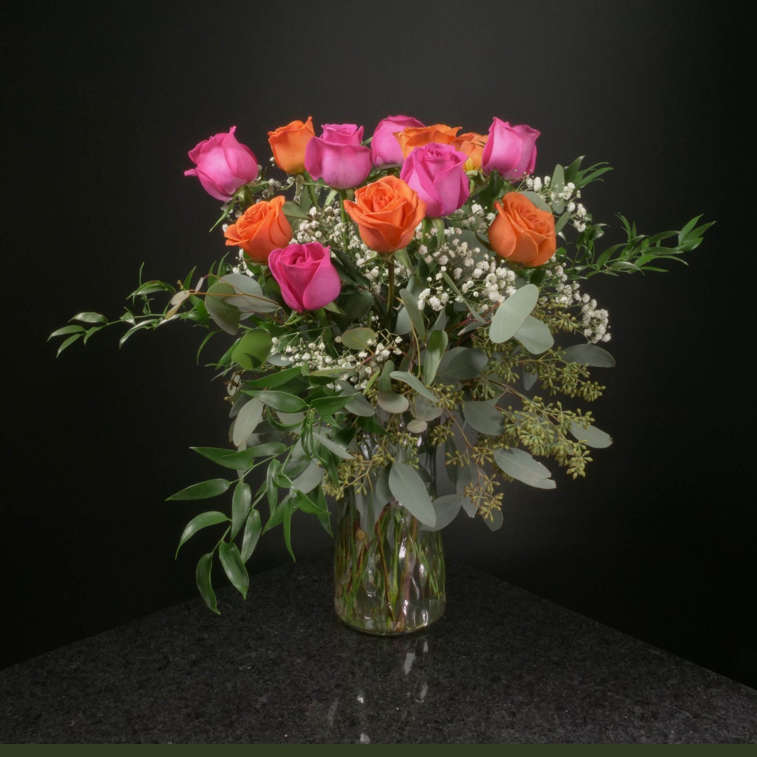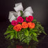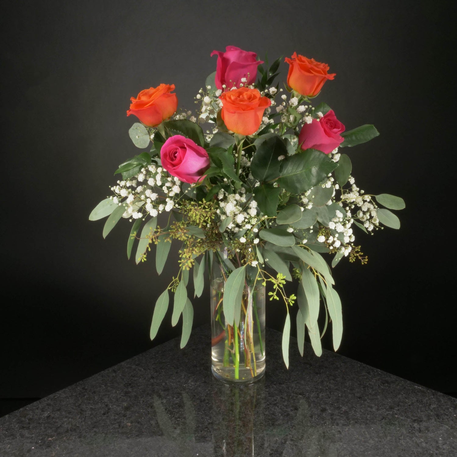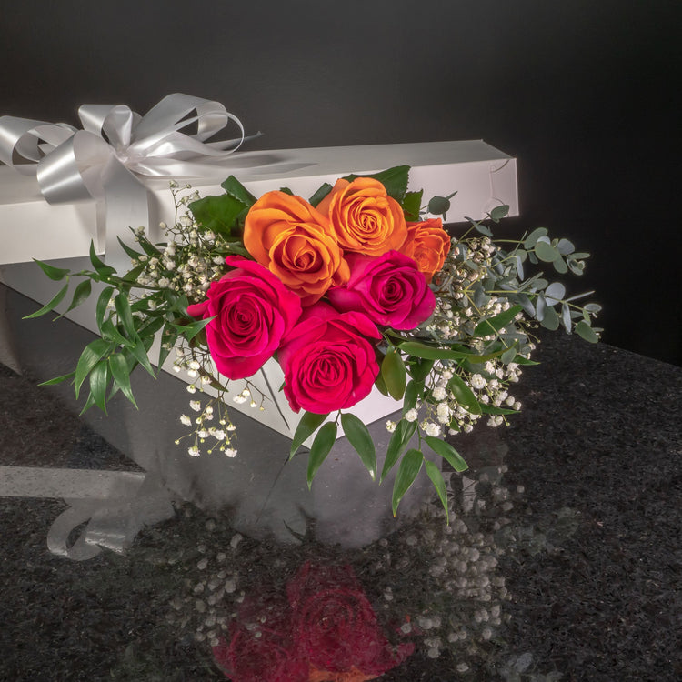 Half a dozen mixed orange and hot pink roses delicately accented with a touch of leather fern and Israeli ruscus carefully arranged in a hand tied bouquet with a beautiful wrap finish