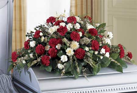 Nostalgia Casket Spray is full of red and white flowers and greens