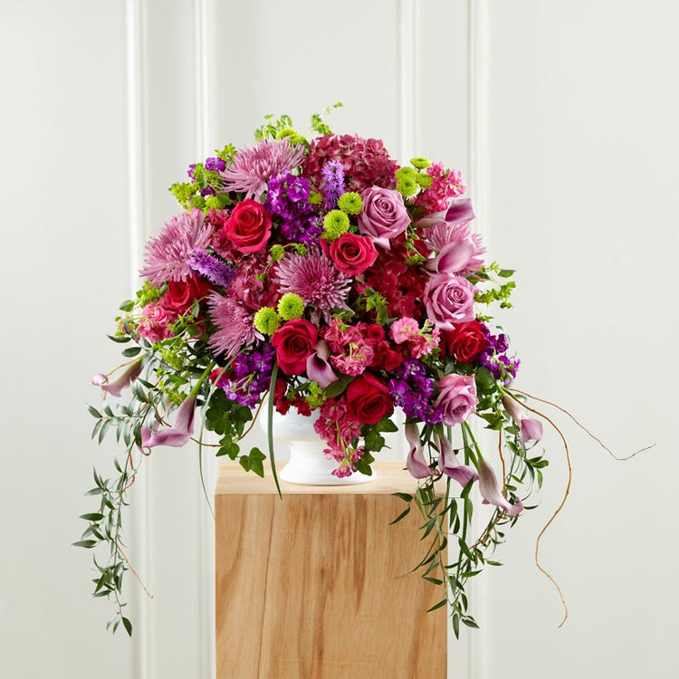 When you’re looking for an outstanding, yet appropriate expression of sympathy at a wake or funeral, this colorful mixed flower bouquet makes an exquisite choice. Handcrafted by a local artisan florist this vibrant purple and pink arrangement combines mini calla lilies, spider chrysanthemums, roses, stock, bupleurum, pompons and hydrangeas with a cascade of lush greenery that creates the illusion of “weeping.” It’s set in a generously-scaled plastic urn that has the look of white ceramic and