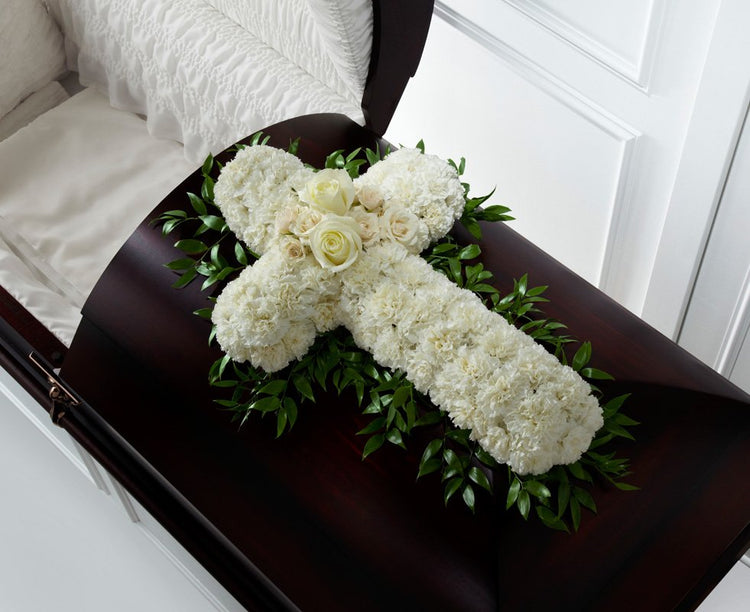 The Peaceful Memories™ Casket Spray is a gorgeous way to commemorate the faith and devotion of the deceased. White carnations are arranged in the shape of a cross accented in the middle with white roses and spray roses and along the sides with lush greens to create a lovely casket spray that brings peace and solace to those that attend their final farewell.