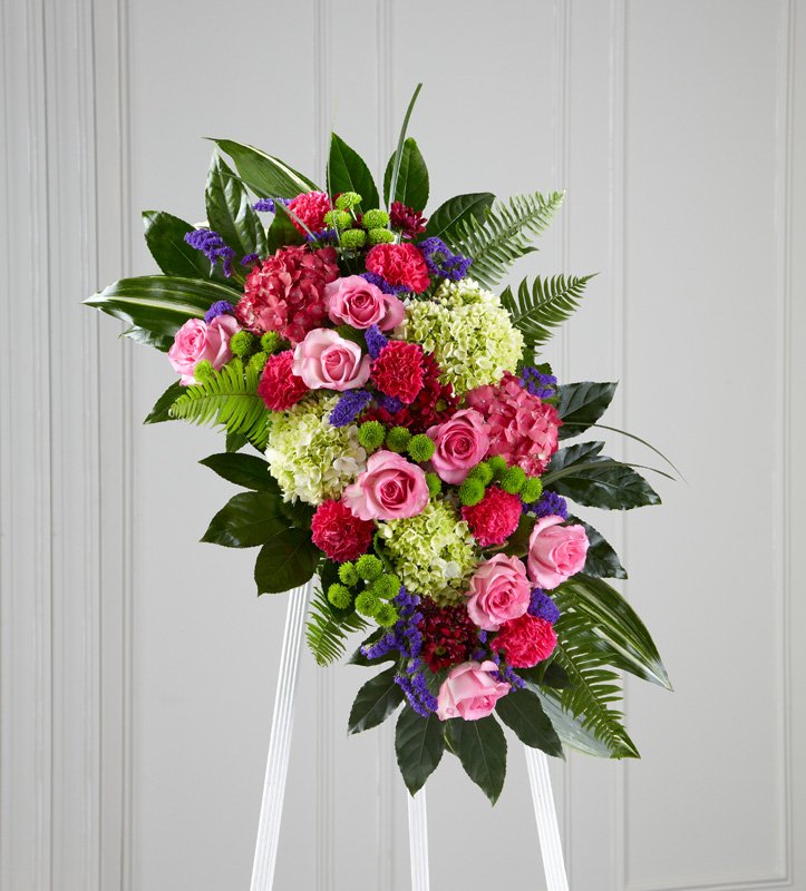 This glorious celebration of life combines the vibrant, hopeful colors of spring in a standing arrangement designed to inspire happy memories of times gone by. Handcrafted by a local artisan florist of bright and beautiful blossoms that include pink roses, magenta carnations, purple statice and hydrangeas, green button pompons and hydrangeas and daisy pompons all arranged against a background of lush green aralia and aspidistra leaves. It’s designed for display on an easel making an impressi