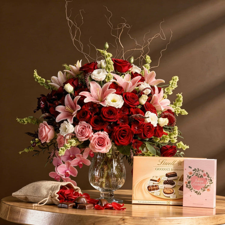 Ideal for: Valentine’s Day flower delivery, romantic surprises, luxury Valentine’s gifts, roses with chocolates.