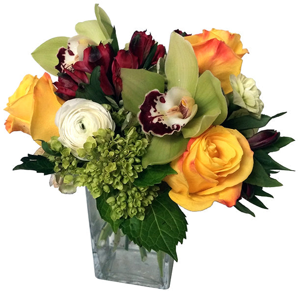 A lovely vase arrangement with Orchids, Renunculus, Alstromeria, Roses and Hydrangea's.