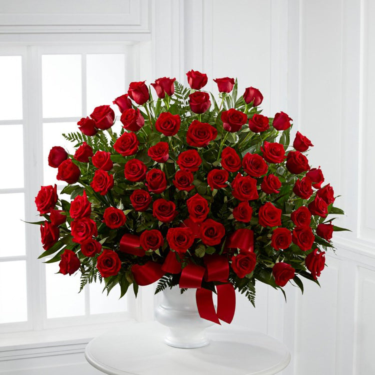 The Soul's Splendor™ Arrangement is a rich display of the love shared throughout the life of the deceased. Brilliant red roses are elegantly displayed in a white designer plastic urn and accented with lush greens and red satin ribbon to create a beautiful tribute to honor your special relationship.