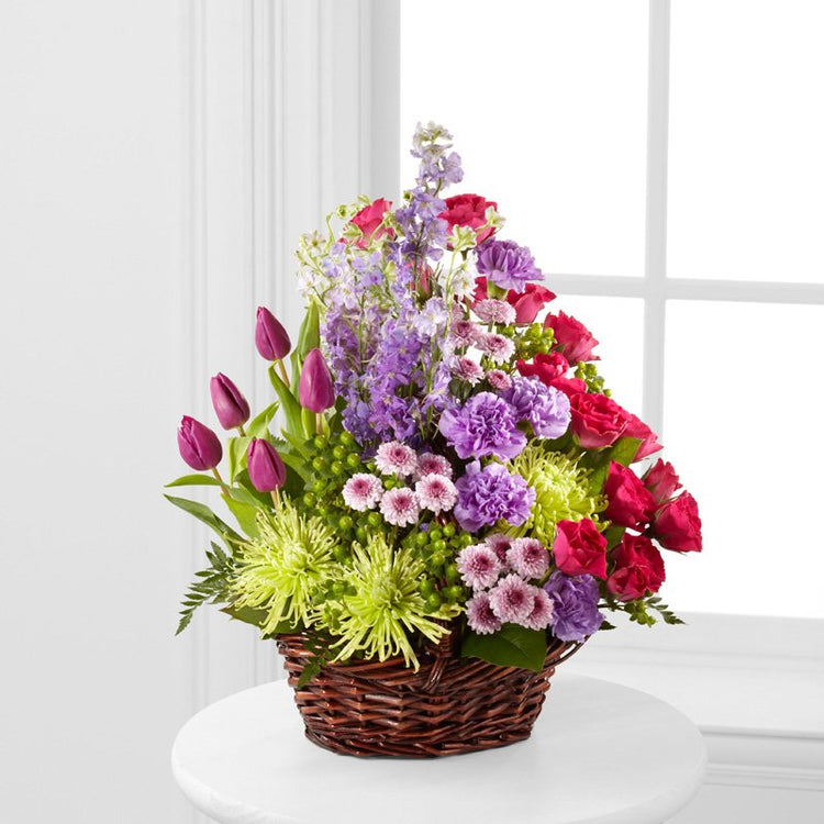 The Truly Loved™ Basket exudes fantastic color, warmth and cheer to convey your most heartfelt sympathies for their loss. Purple tulips, fuchsia spray roses, lavender carnations, lavender larkspur, lavender button poms, jade spider chrysanthemums, green hypericum berries and lush greens are beautifully arranged in a brown willow basket to create a wonderful way to show how much you care.