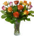 This colourful piece includes 12 colourful roses with greens in a glass vase