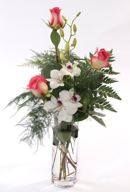 Romantic and classy, this piece features Orchids, Roses and mixed greens in a vase
